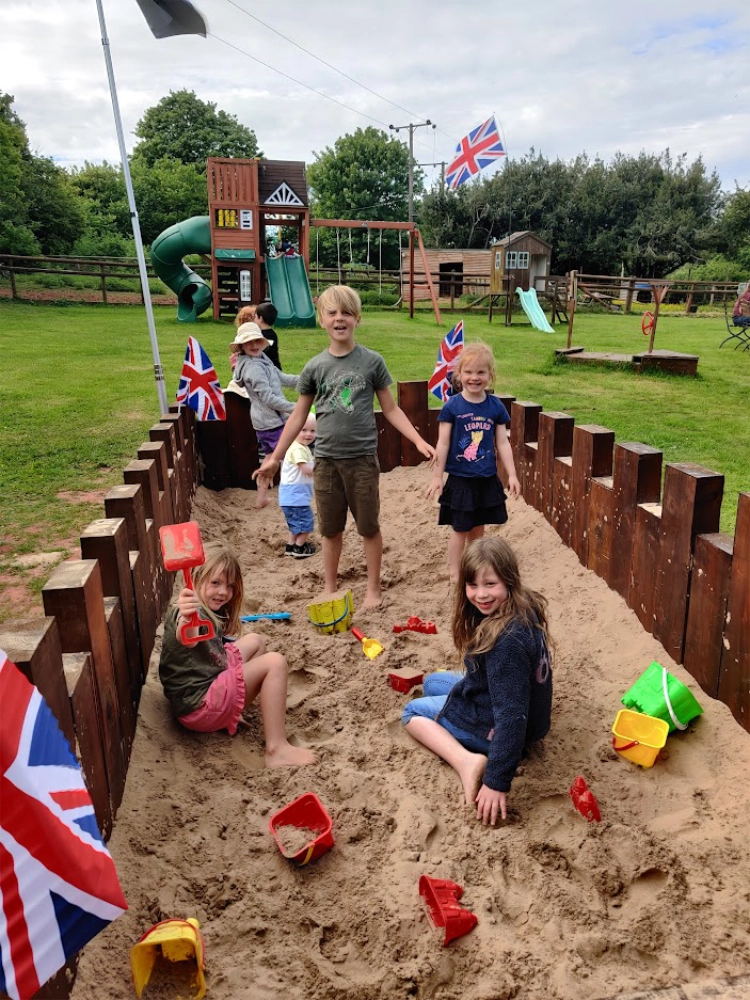 The Orchard Play Area is designed to keep children entertained while giving parents space to relax. At its heart is our Compton Pool castle sandpit with monkey bars and climbing ropes, alongside a separate multi-level play area with swings and slides.